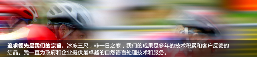自從成立以來,我們?yōu)榭蛻籼峁└咝Ш椭悄芑男畔⑻幚砉ぞ吆妥稍兎?wù)。在這個信息爆炸的時代,如何讓互聯(lián)網(wǎng)上和企業(yè)內(nèi)部的海量信息為我們帶來更多的價值需要高度智能化的信息處理工具。我們提供的技術(shù)能夠高效并且準(zhǔn)確的對大量文本信息進(jìn)行處理、檢索、挖掘、翻譯等工作,并可方便地與信息系統(tǒng)的其他模塊進(jìn)行整合。